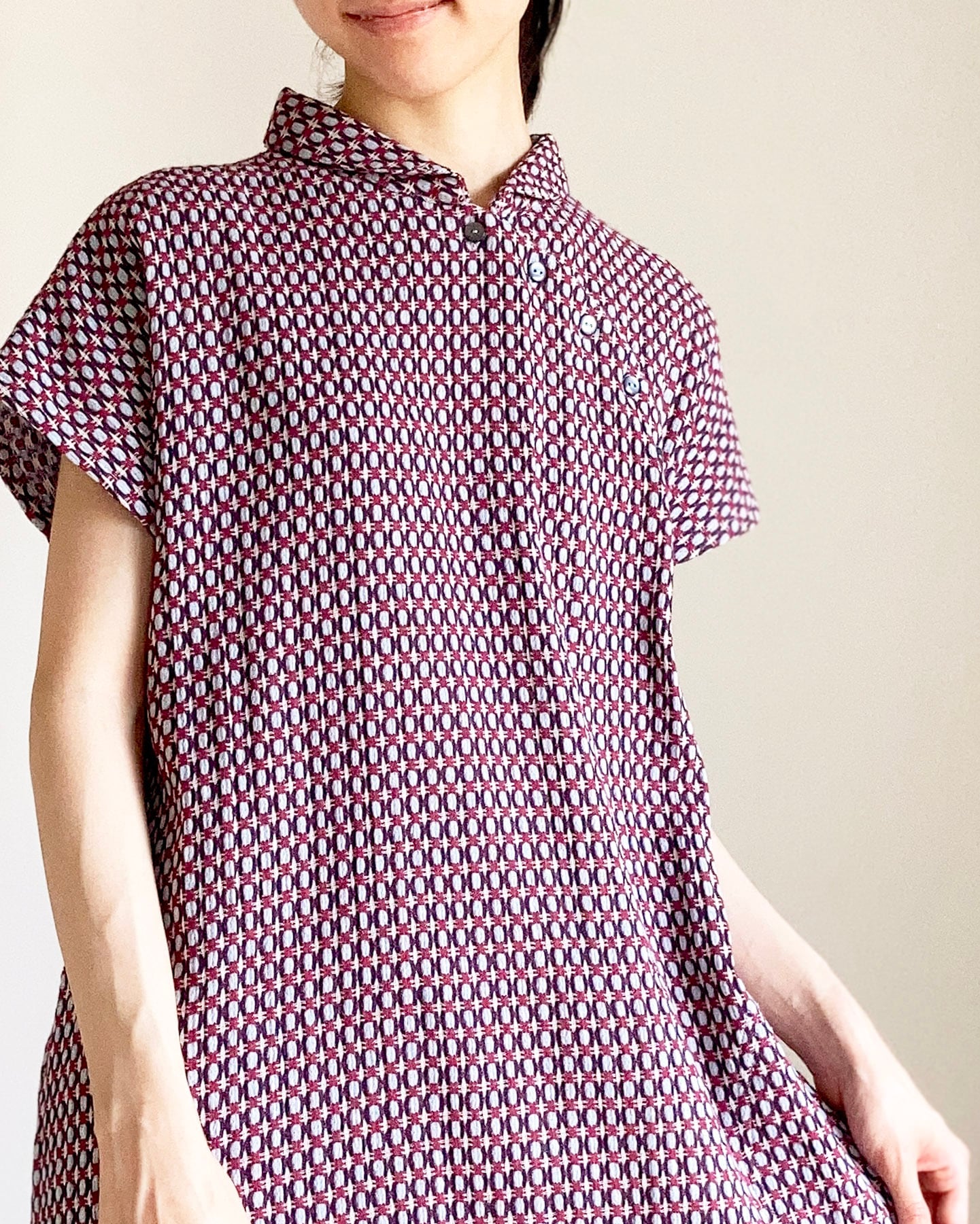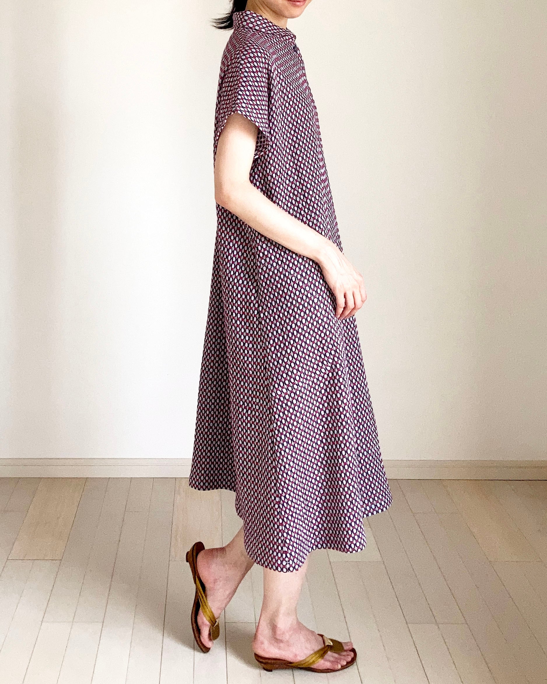 斜めボタンがアクセントになっているチャイナカラーワンピースです。切替のないすとんとしたデザインですっきりと洗練された印象に仕上げました。袖は肩をさりげなくカバーしながら涼しく着用できるフレンチスリーブになっています。綿100%で肌触りもよく、暑い季節にも気持ちよく着ていただけます。