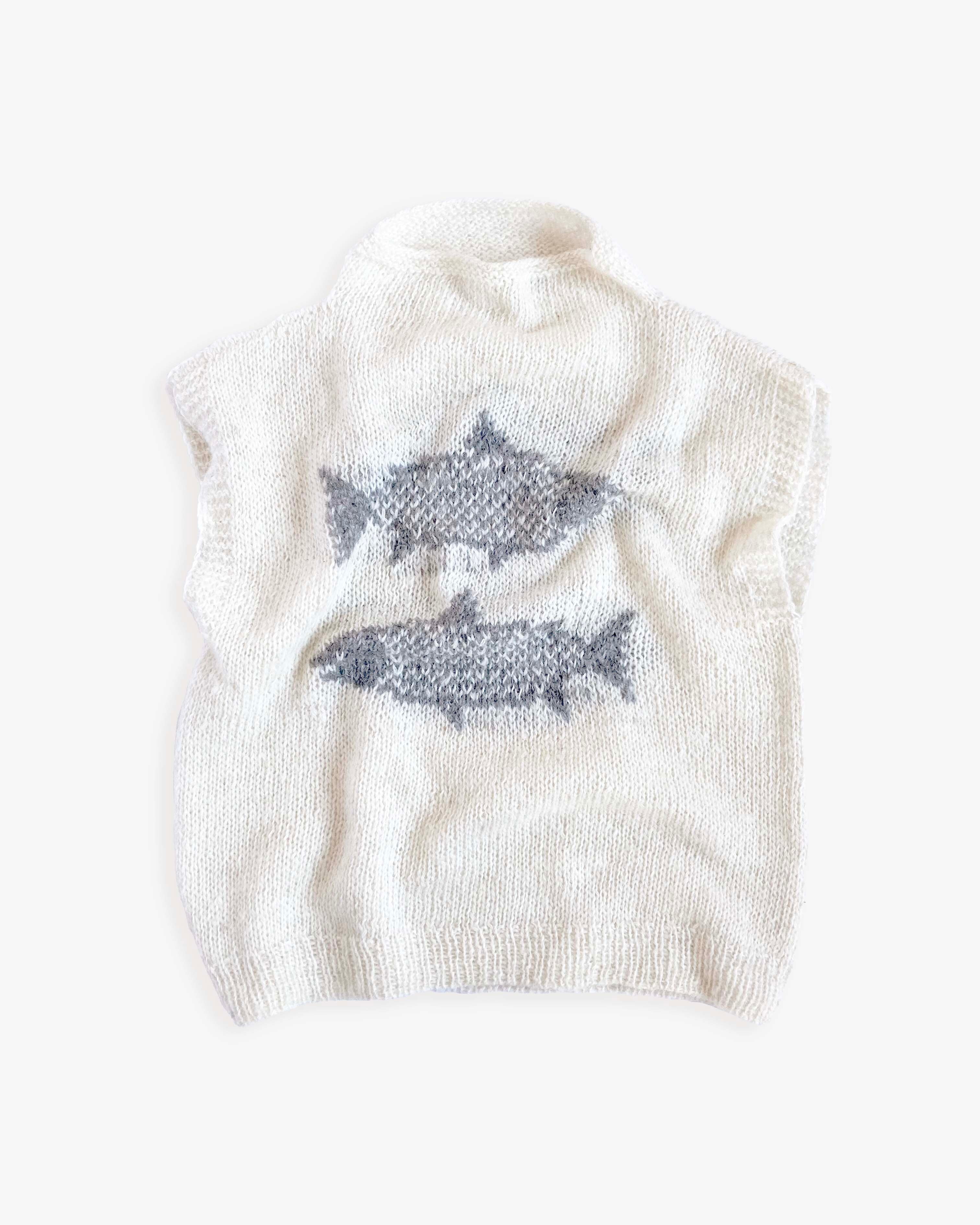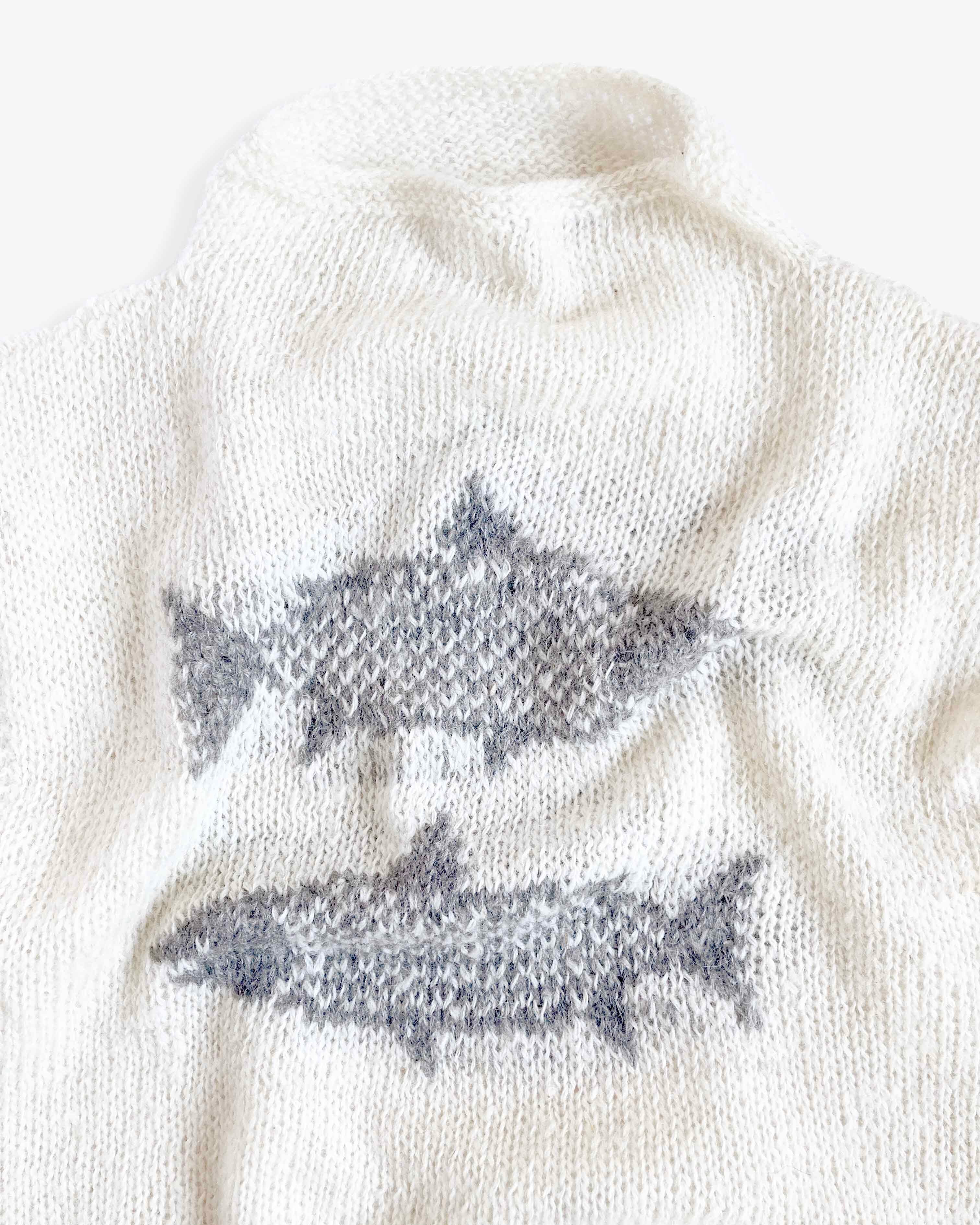 アルパカの原毛をRueca(ルエカ)と呼ばれるコマを使い、手で紡いだ糸を棒針でひとつひとつ丁寧に編み上げたニットです。さかなモチーフがちょっぴり個性的でかわいい一枚。さまざまなレイヤードスタイルが楽しめます。