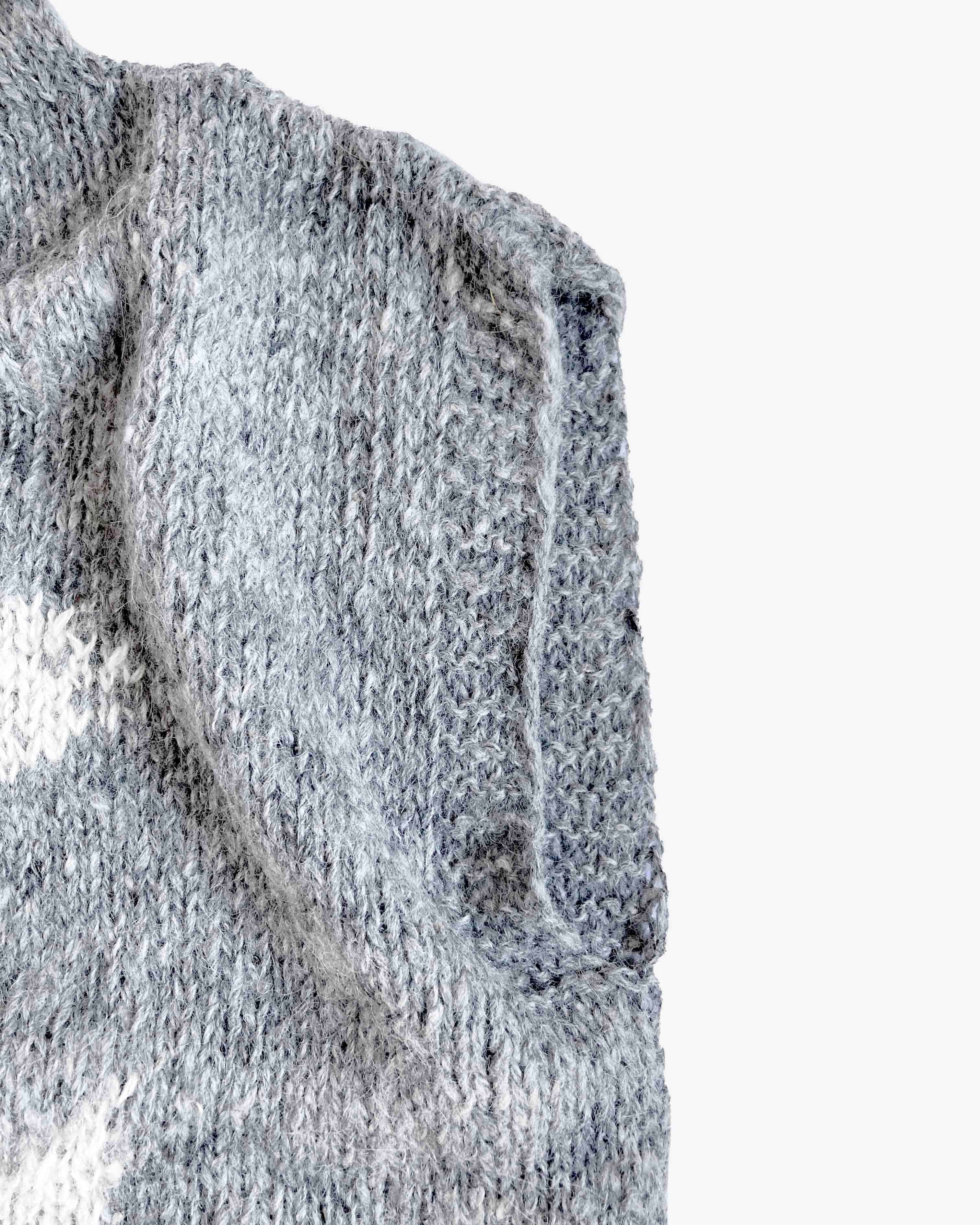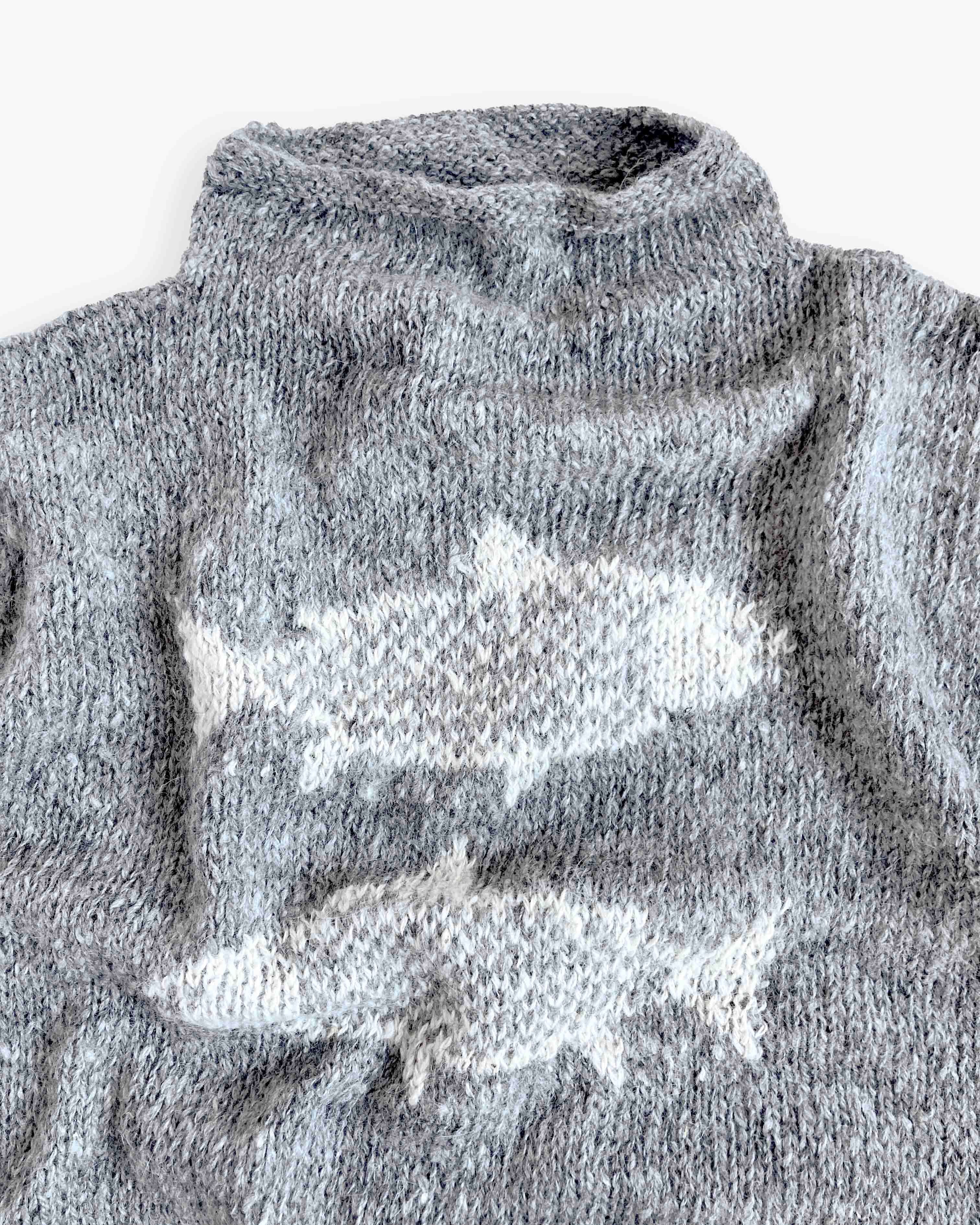 アルパカの原毛をRueca(ルエカ)と呼ばれるコマを使い、手で紡いだ糸を棒針でひとつひとつ丁寧に編み上げたニットです。さかなモチーフがちょっぴり個性的でかわいい一枚。さまざまなレイヤードスタイルが楽しめます。