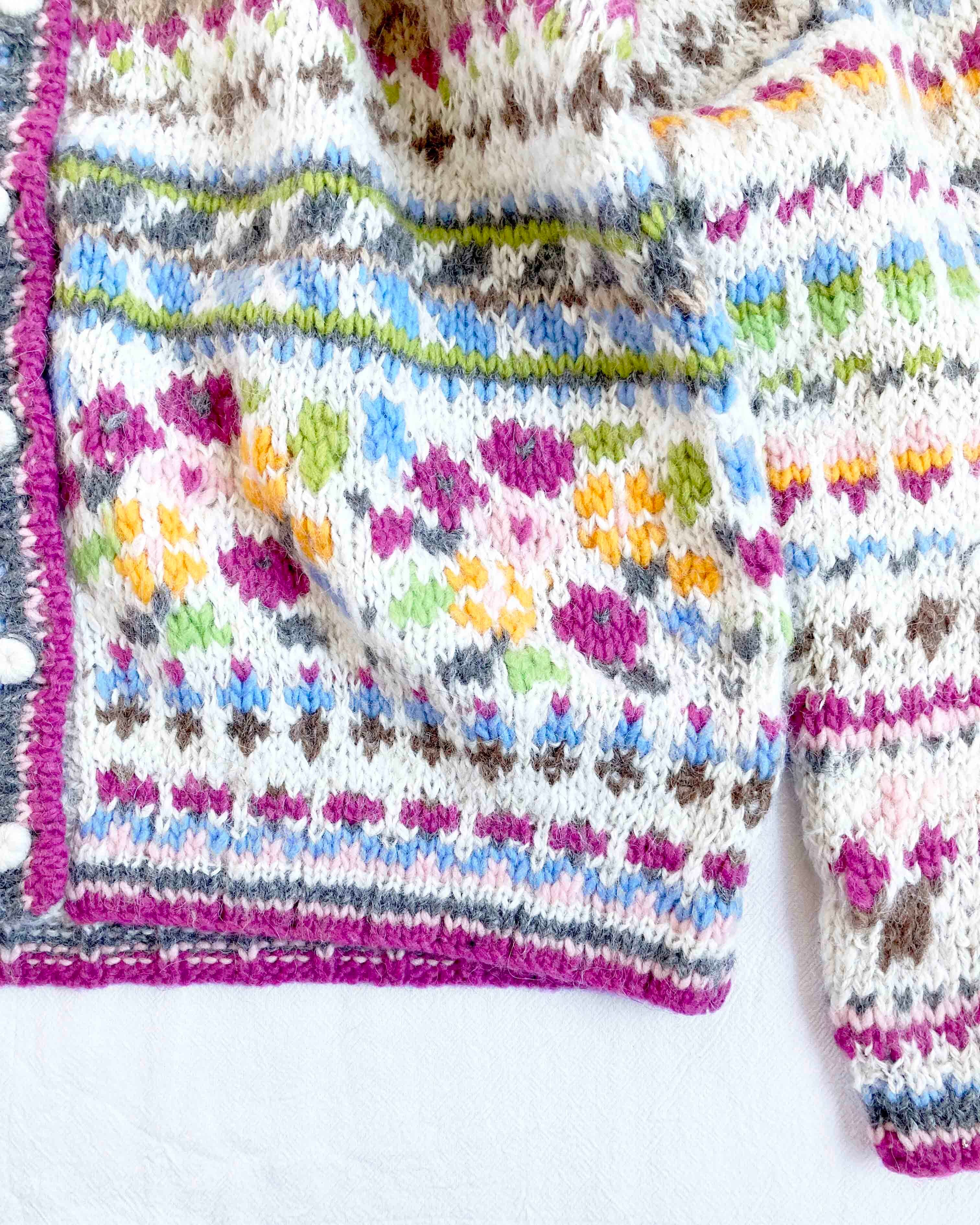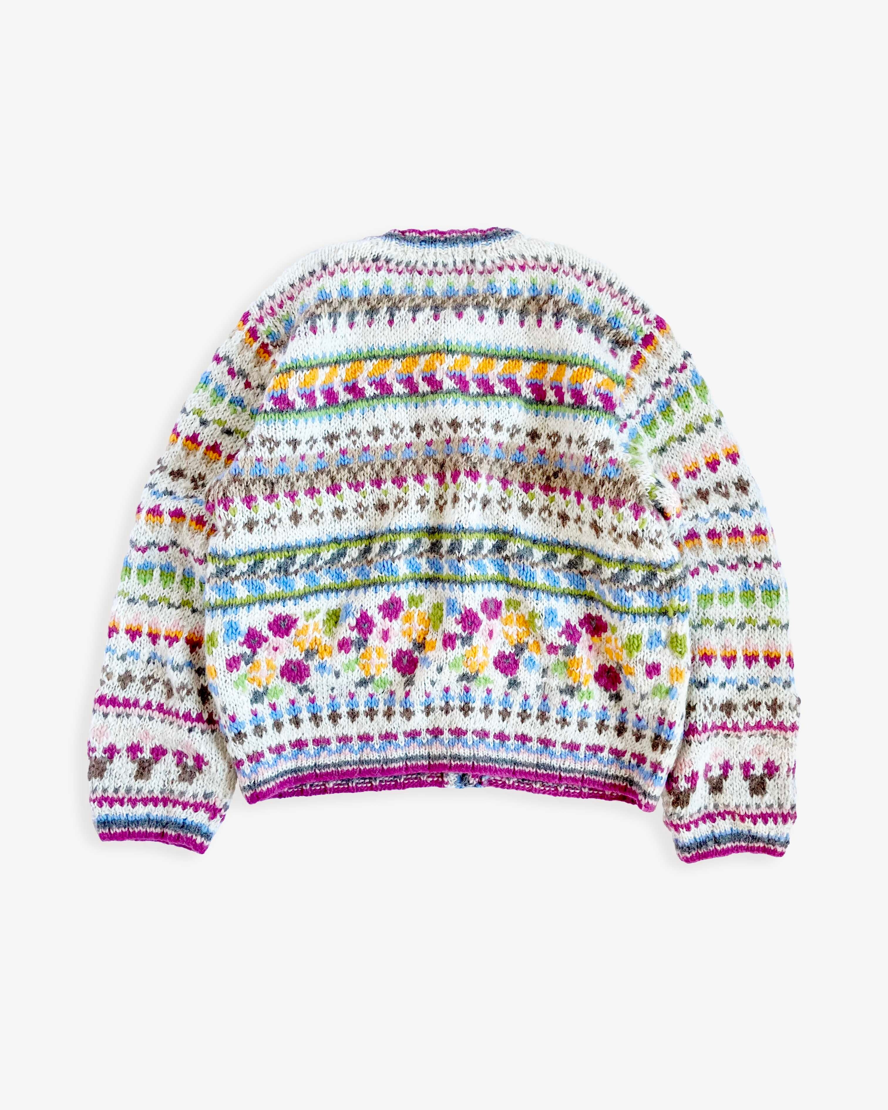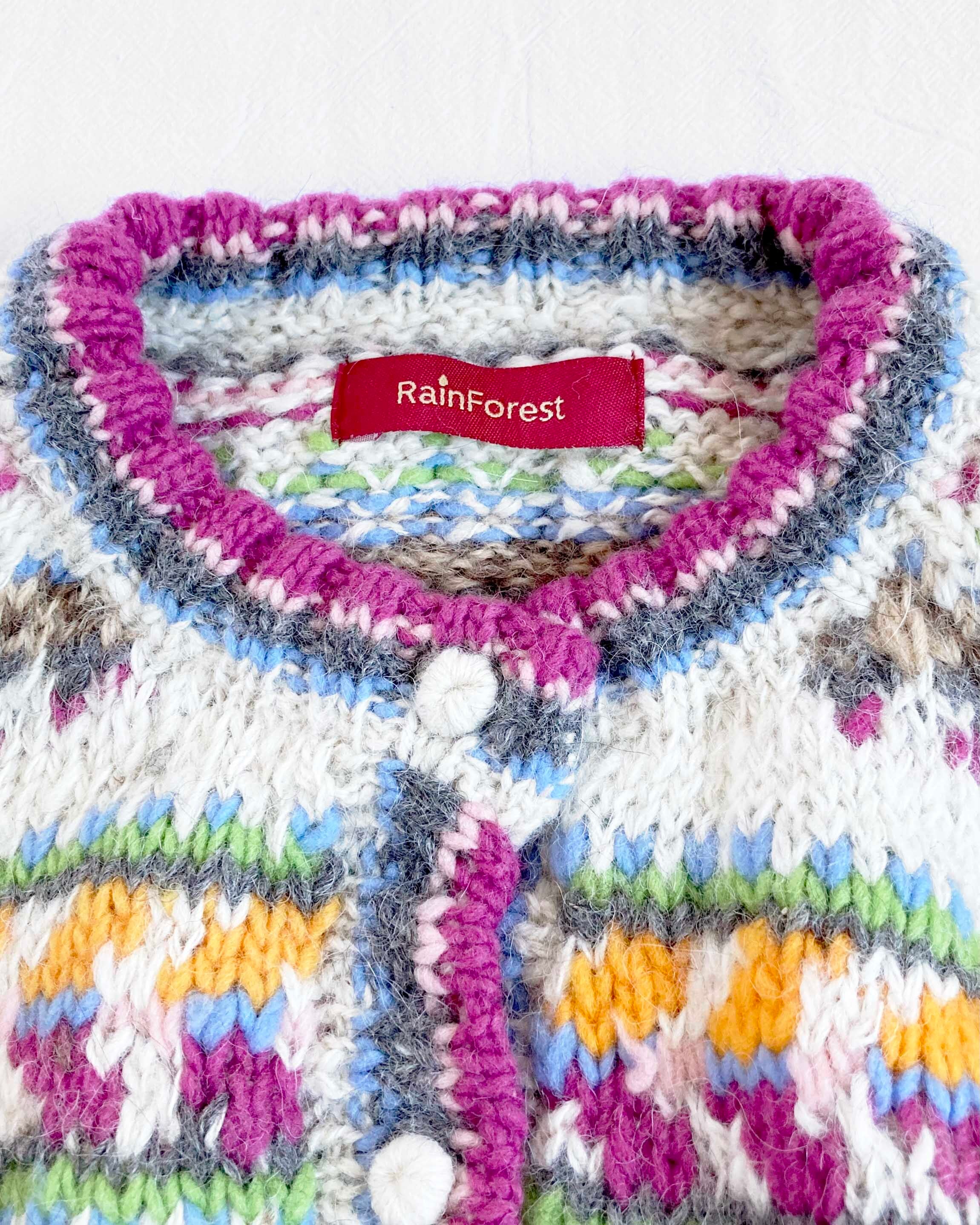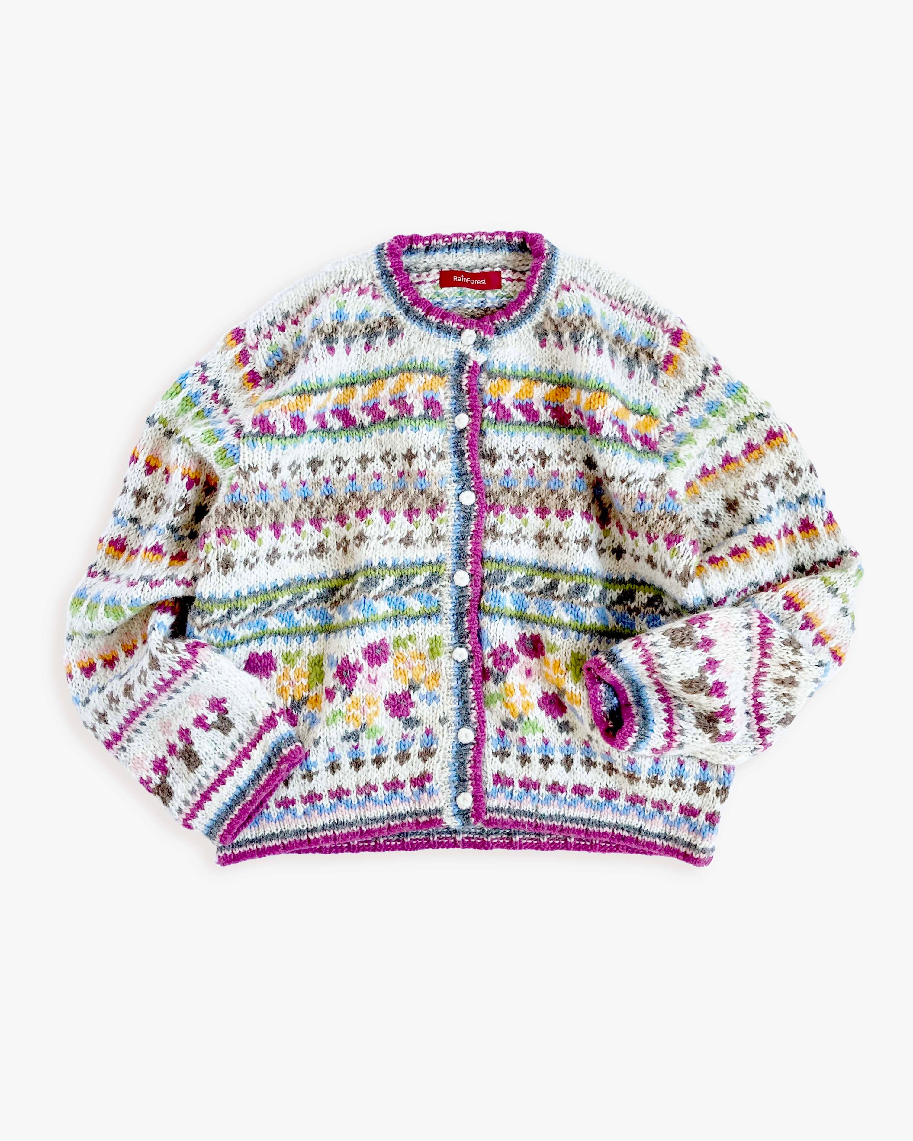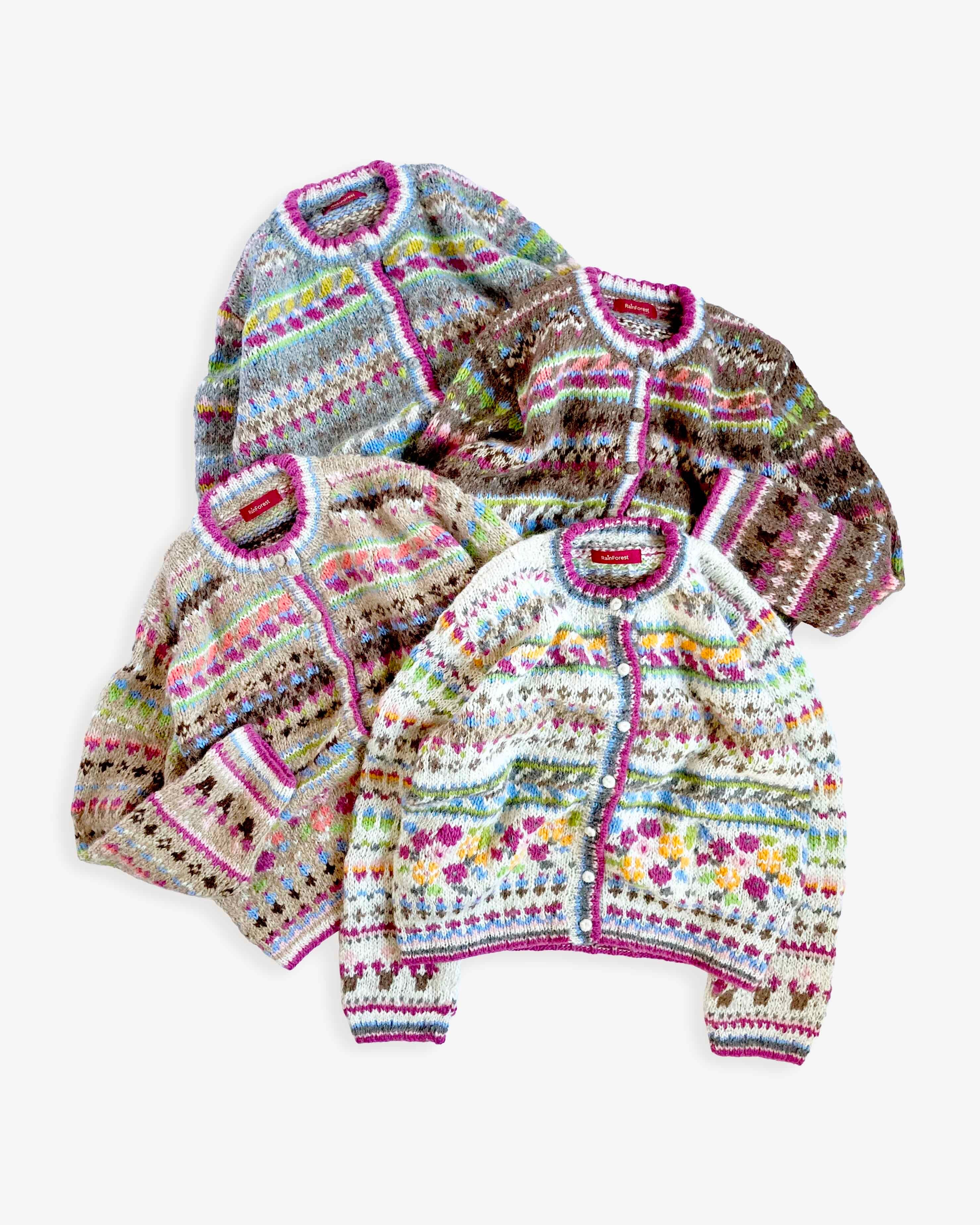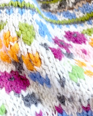 カラフルなフラワーモチーフの柄がかわいい一枚。アルパカの糸は手紡ぎのものを使用しており軽さがありながらウール混でしっかりとした温かさも感じられます。パンツでもスカートでも合わせられる丈です。ワンピースとの相性も◎