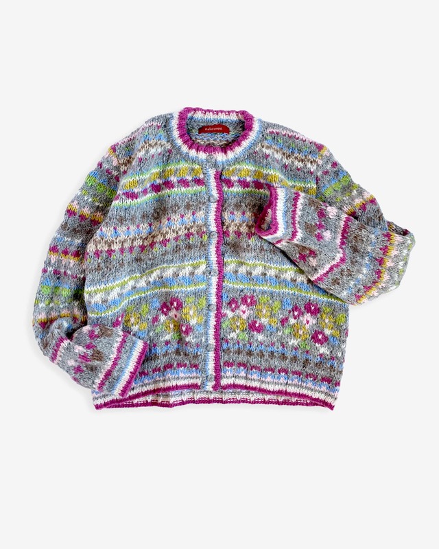 カラフルなフラワーモチーフの柄がかわいい一枚。アルパカの糸は手紡ぎのものを使用しており軽さがありながらウール混でしっかりとした温かさも感じられます。パンツでもスカートでも合わせられる丈です。ワンピースとの相性も◎