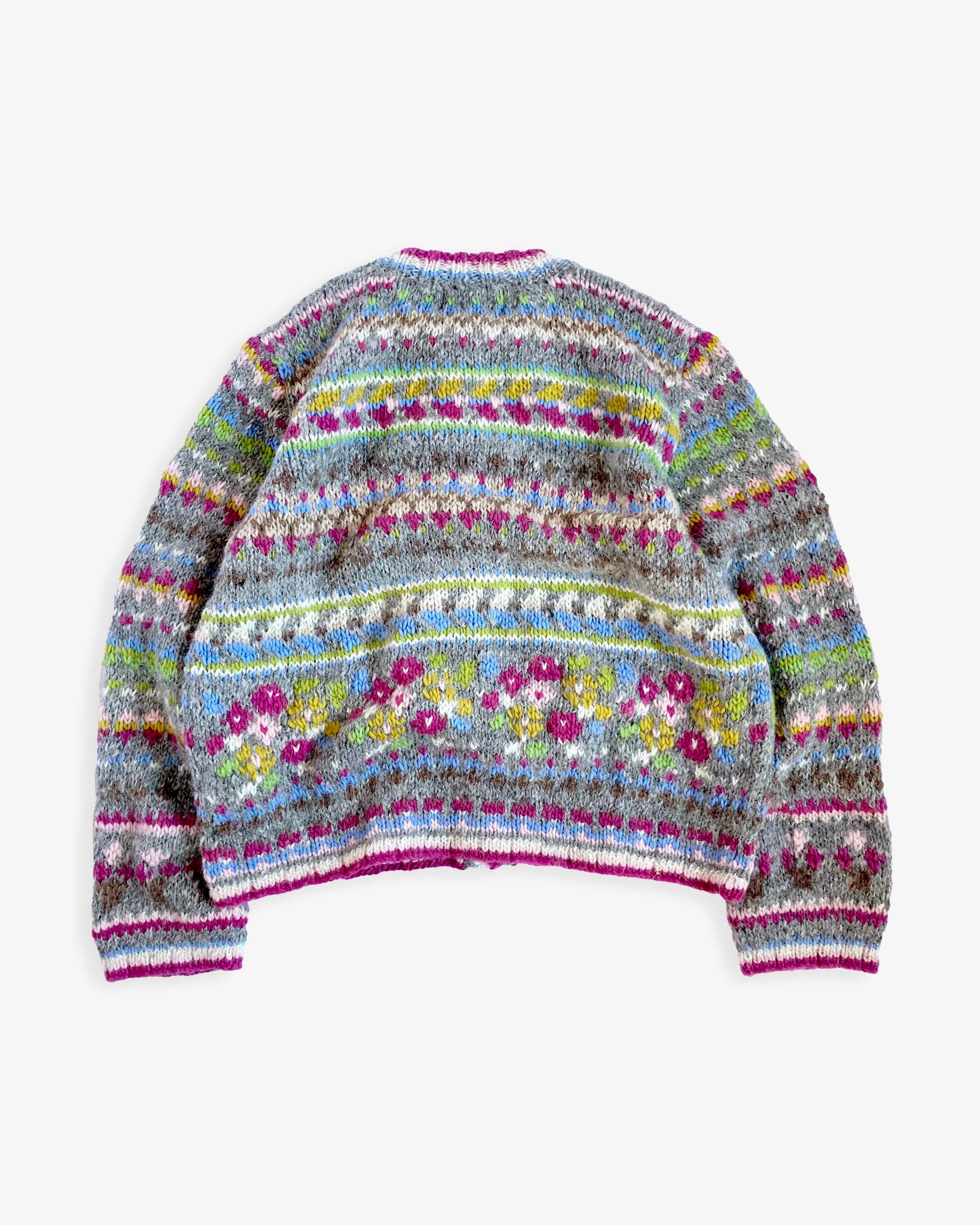 カラフルなフラワーモチーフの柄がかわいい一枚。アルパカの糸は手紡ぎのものを使用しており軽さがありながらウール混でしっかりとした温かさも感じられます。パンツでもスカートでも合わせられる丈です。ワンピースとの相性も◎