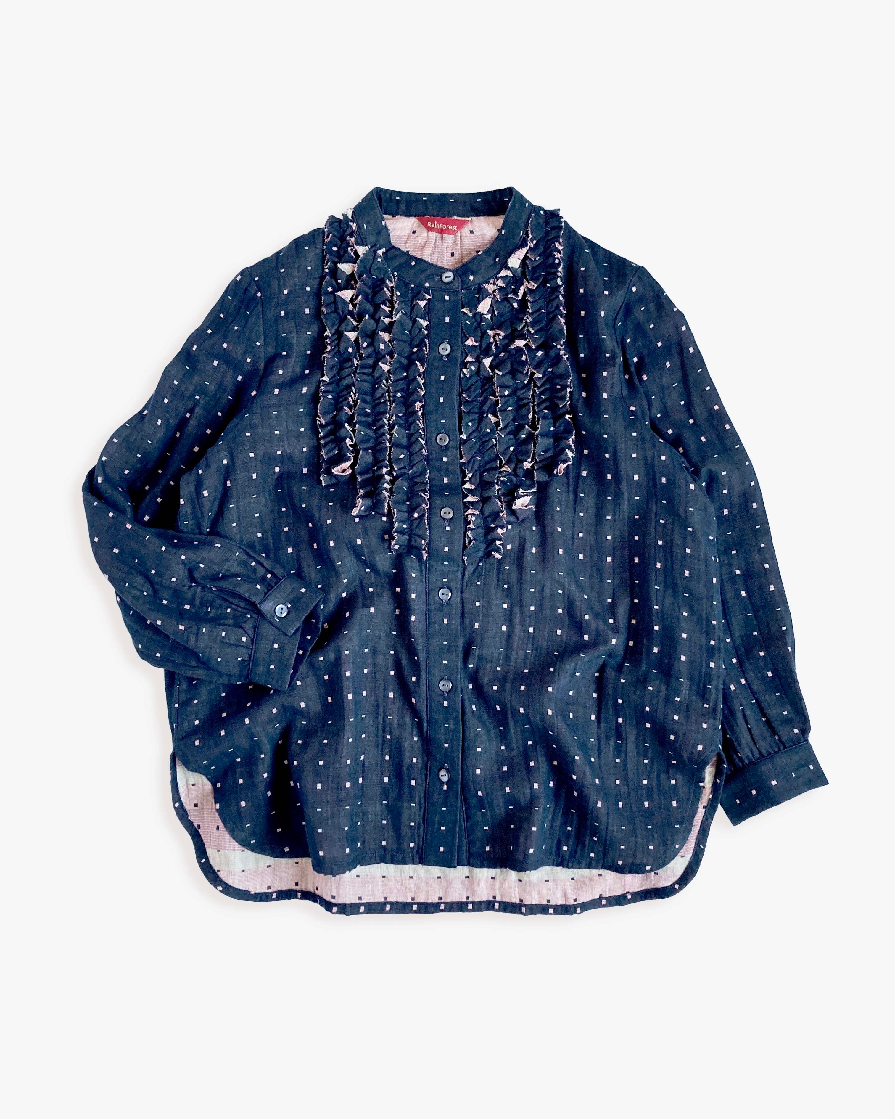 前見頃にフリルをあしらって女性らしさをプラスしたシャツブラウスです。肌にやさしい綿100%のダブルガーゼの生地を使用しています。パンツでもスカートでも合わせられる丈で、コーディネートの幅が広がります。