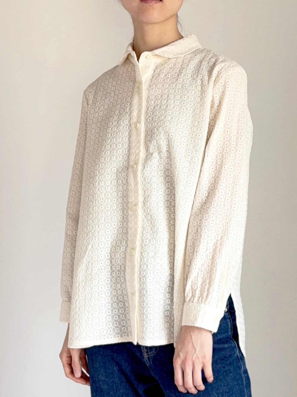 繊細なレースと襟や裾のデザインに丸みを加えてフェミニンな雰囲気を