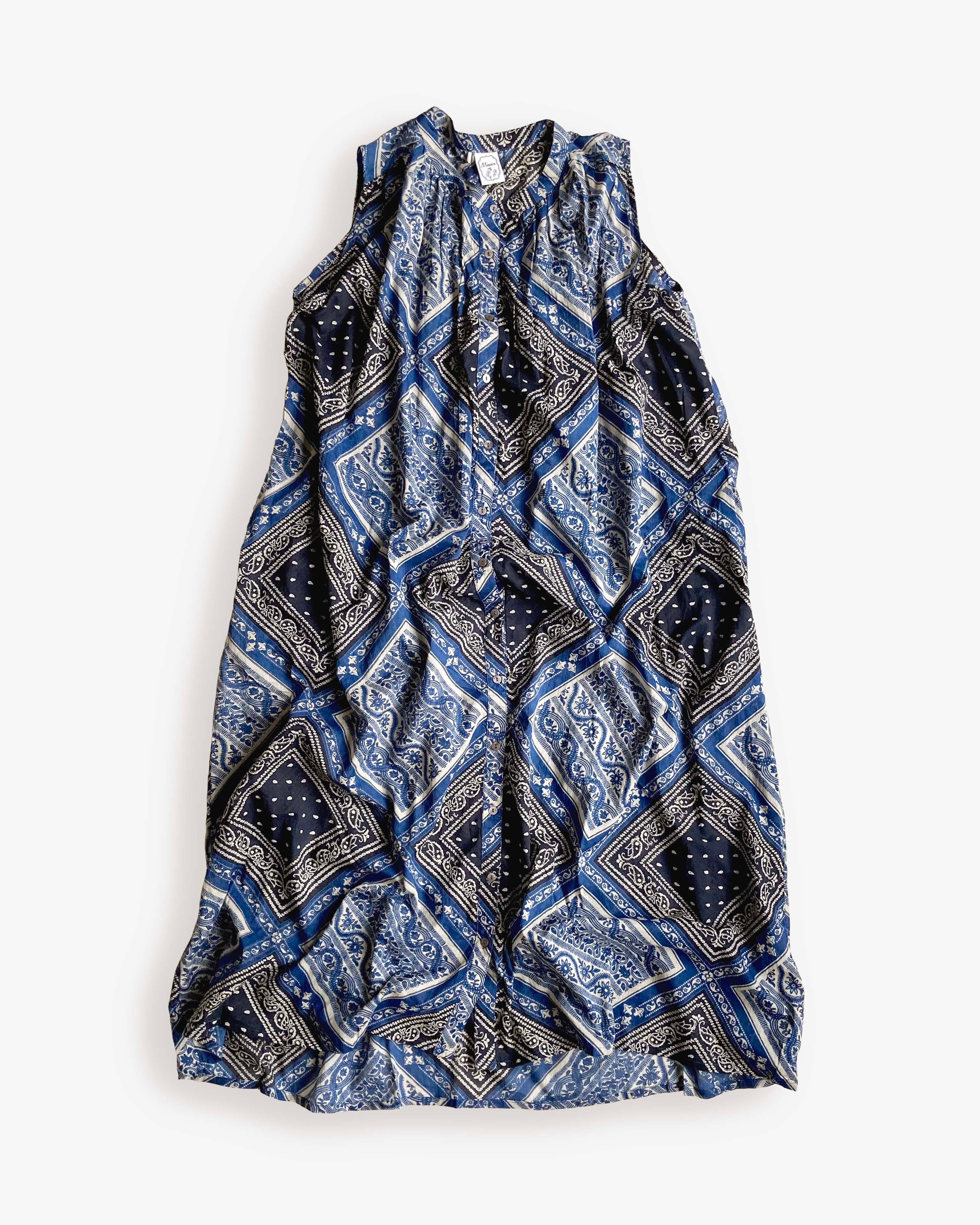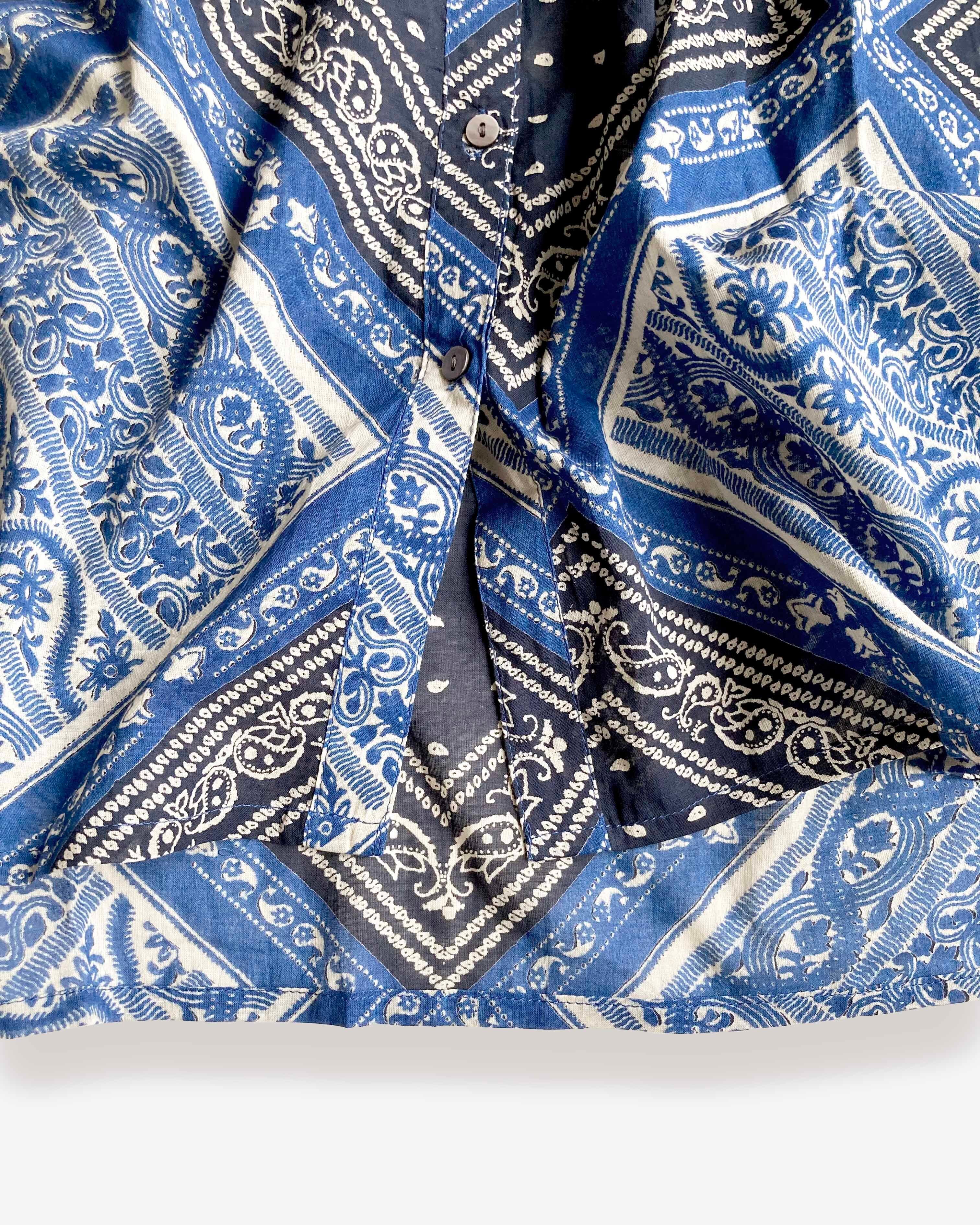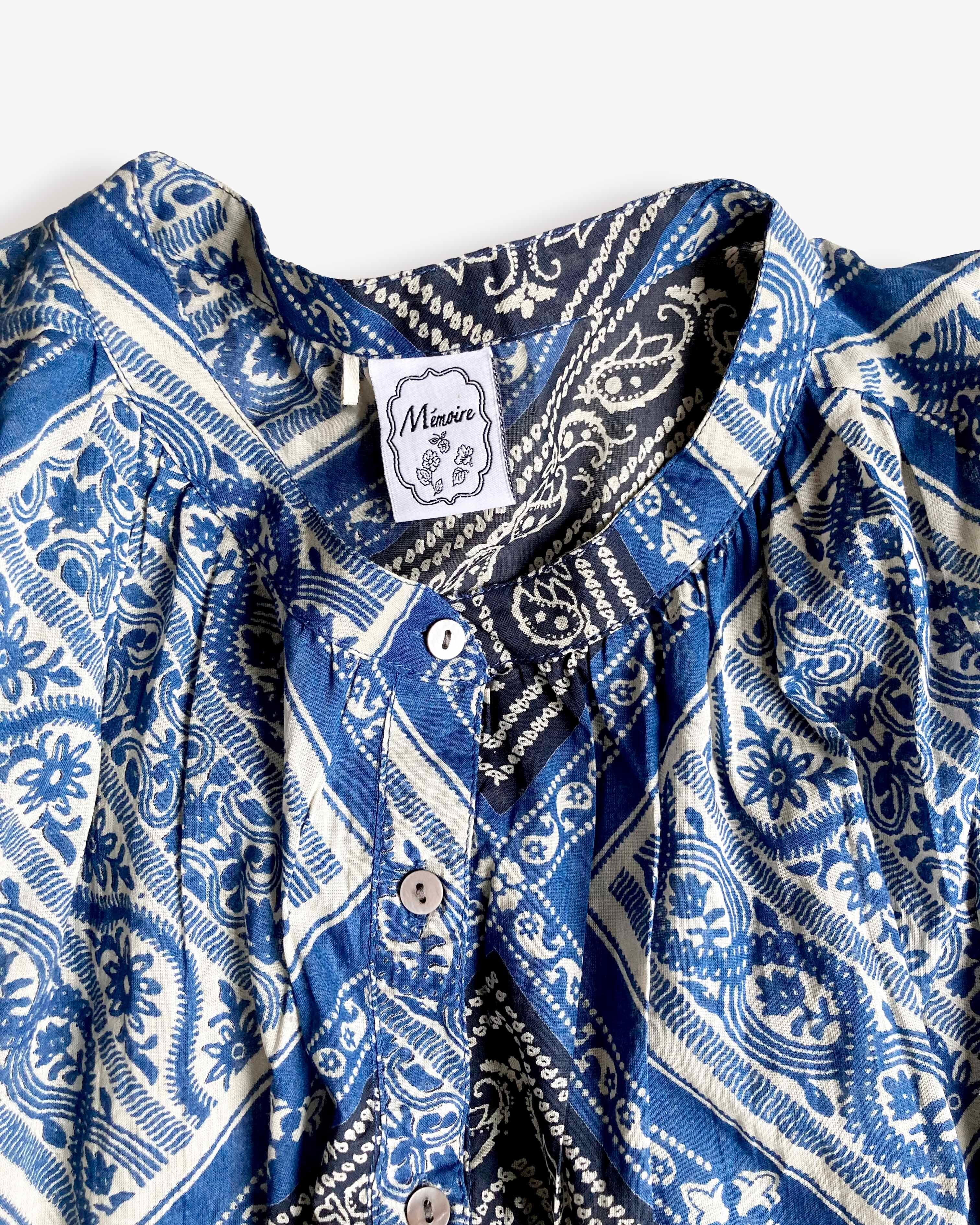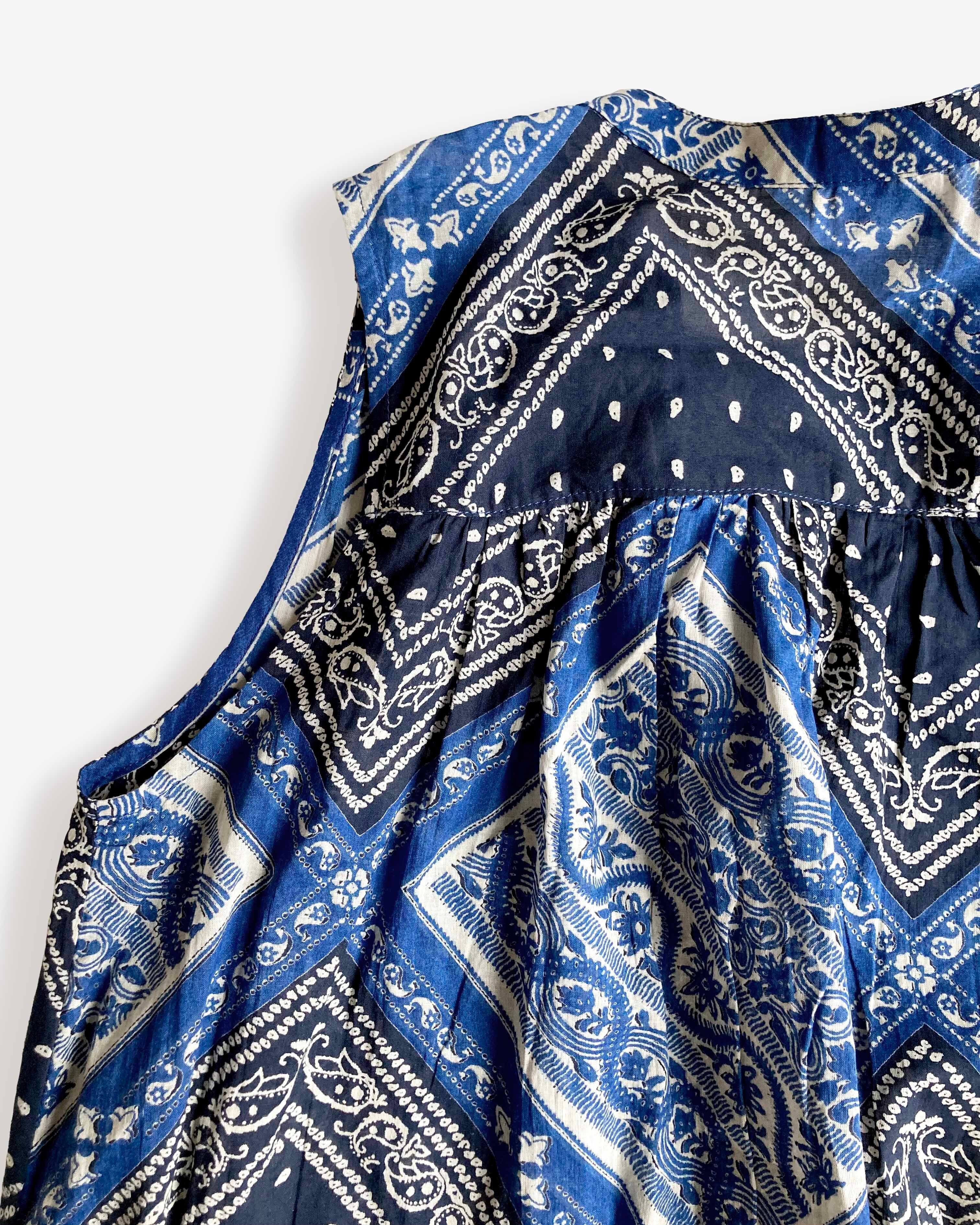 インパクトのあるバンダナ柄プリントが目を惹くシリーズです。コットン100%のボイル生地を使用しており、とても軽やかな着心地です。顔をスッキリと見せてくれるバンドカラーと、たっぷりと入ったギャザーがポイント。ふんわりシルエットで体型カバーも叶えてくれる1枚です。前を開けてジレとしてパンツスタイルに軽く羽織るのもおすすめです。