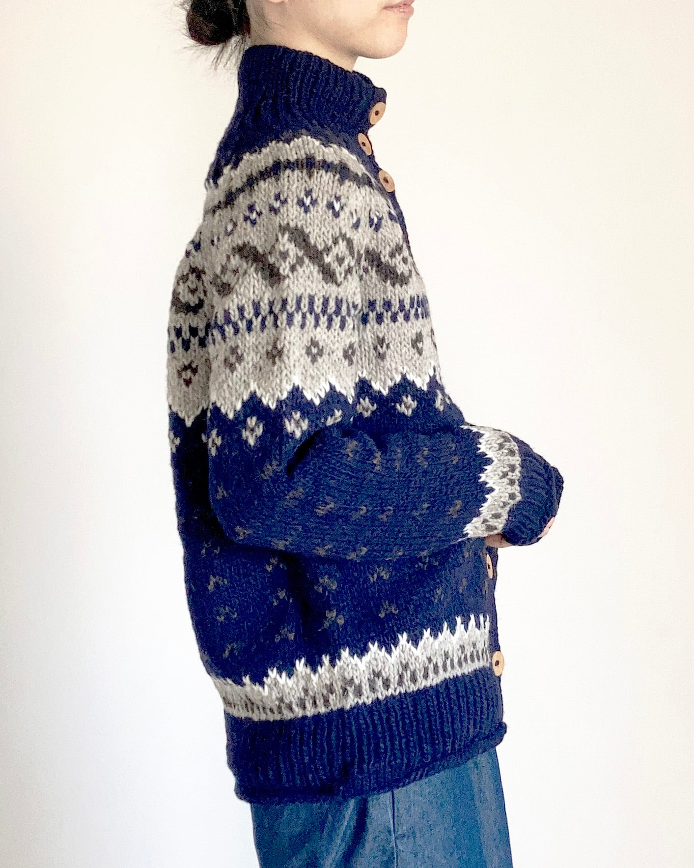 手編みならではの魅力たっぷりなざっくりニット。袖口・裾に天竺編みを入れて、くるんとさせることでこなれ感を演出してくれるポイントになっています。ハイネックでも襟元のボタンを外して襟仕様で着ていただくこともできます。