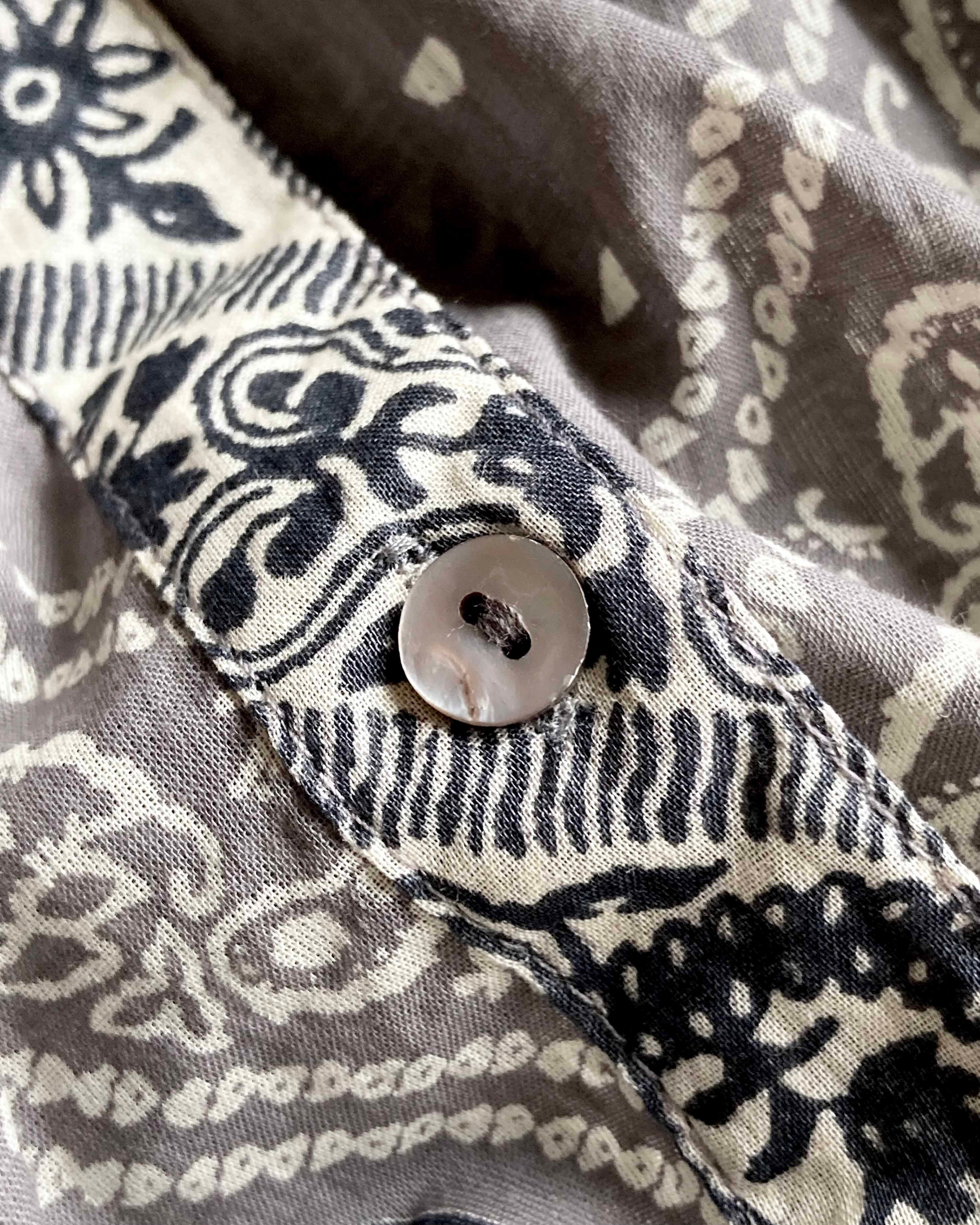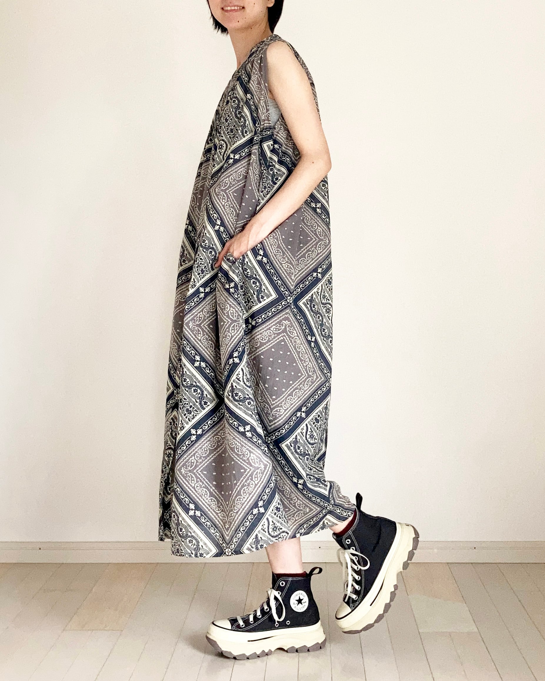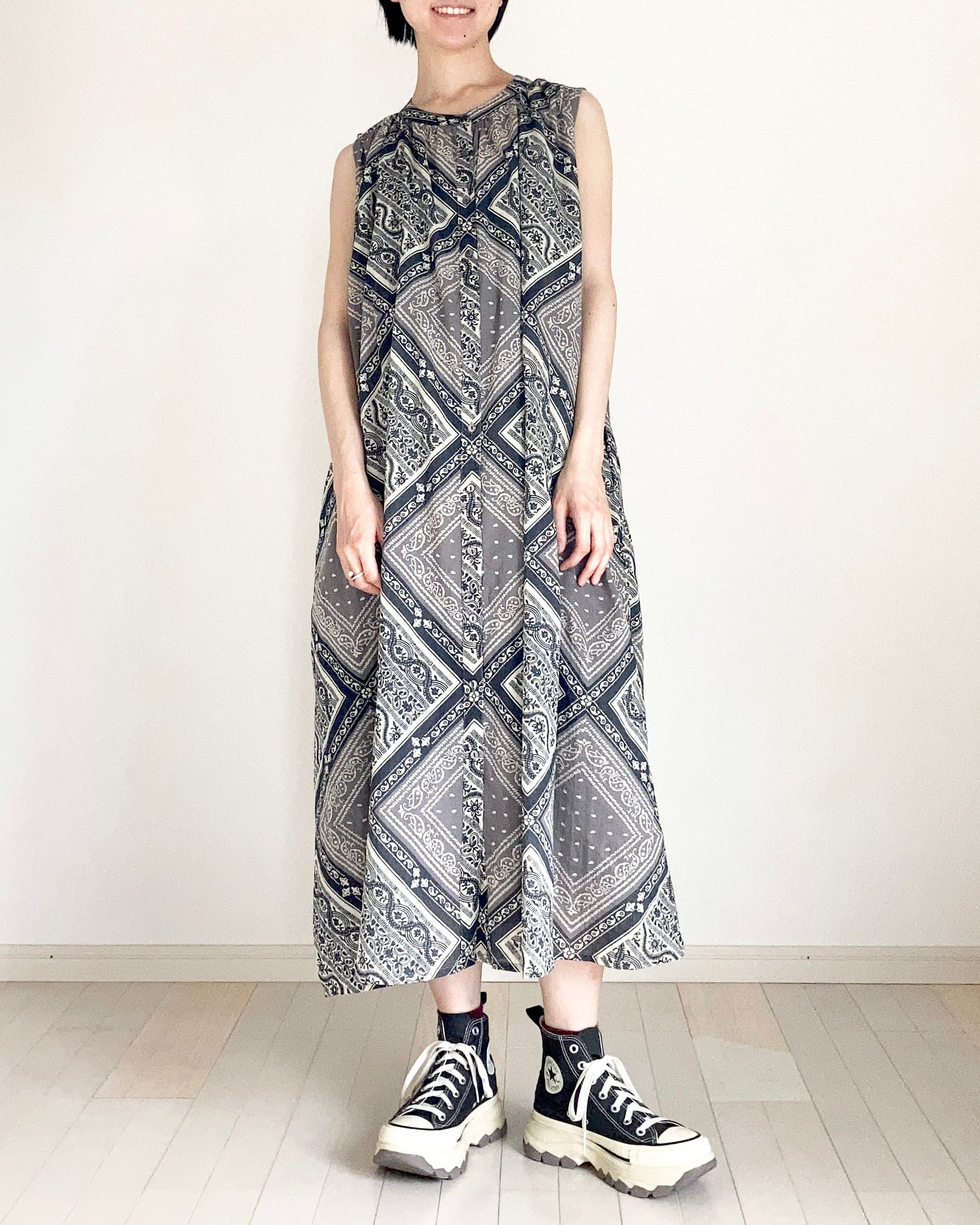 インパクトのあるバンダナ柄プリントが目を惹くシリーズです。コットン100%のボイル生地を使用しており、とても軽やかな着心地です。顔をスッキリと見せてくれるバンドカラーと、たっぷりと入ったギャザーがポイント。ふんわりシルエットで体型カバーも叶えてくれる1枚です。前を開けてジレとしてパンツスタイルに軽く羽織るのもおすすめです。